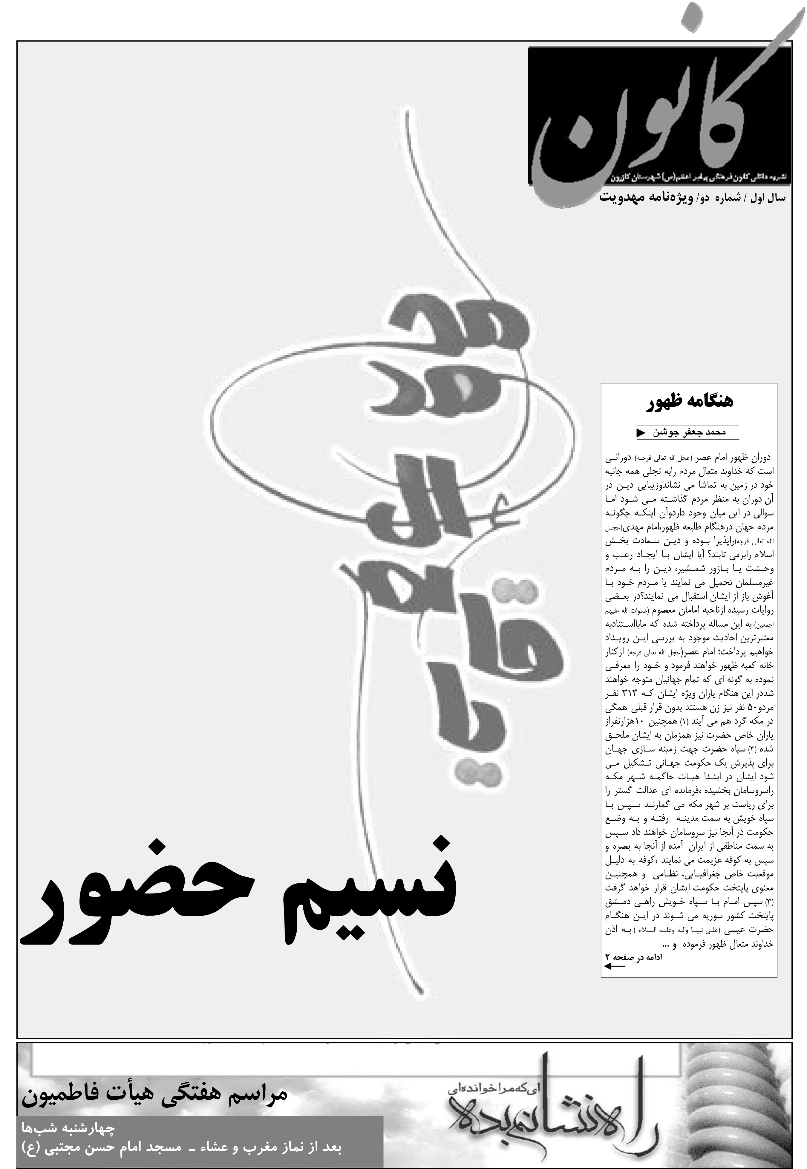 آبانماه سال 1387، مصادف شده بود با ارتقاء کیفی گاهنامه "کانون"؛ بدین صورت که تصمیم گرفته بودیم تا نشریه ای در حوزه فرهنگ و معارف اسلامی شهرستان راه اندازی کنیم و این تغییر رویکرد را به نام مبارک موعود ادیان متبرک نمودیم و اولین ویژهنامه مان را با یاد او منتشر کردیم. حاصل آن تلاش هم نشریه ای 8 صفحه ای بود که مقالاتش به شرح زیر است: