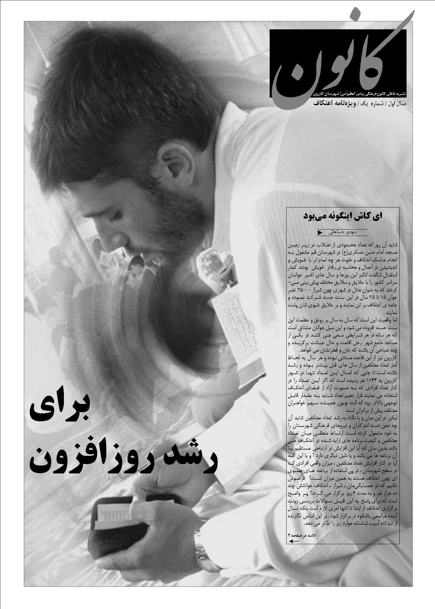 تابستان سال 1378 که با جمعی از دوستان اقدام به تشکیل کانون فرهنگی پیامبر اعظم (ص) و برگزاری طرح نخبه پروری " مهدی یاوران" کردیم، یکی از برنامه هایمان برگزاری و مدیریت اعتکاف در مسجد امام حسین(ع) بود. برنامه ای متنوع و معرفت محور که البته اندک ایراداتی هم داشت. حقیر چون معاونت فرهنگی کانون را در آن سالها داشتم و تجمع بیش از 15 طلبه و ارایه برنامههای متنوعی را از آنان می دیدم و همچنین ایرادات برگزاری اعتکاف را در سطح کلان متوجه شده بودم، با همکاری همان جمع و برخی از دوستان دیگر، اقدام به راهاندازی گاهنامه " کانون" نموده و اولین شماره آن را به نقد و بررسی اعتکاف آن سال و ارایه راهکارهایی برای بهتر برگزار شدن آن در سال های آینده پرداختیم. ماحصل آن تلاش، وی»ه نامه ای 8 صفحهای شد که با همیاری مدیرمسوول محترم هفته نامه شهرسبز به عنوان ویژهنامه آن نشریه منتشر شد.